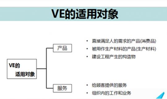VE适用的产品是指企业、组织等制造的产品和建设构造物。产品分为消费品和生产商品。消费品是指家庭用电器、汽车等直接满足人的需求的产品,生产商品是指机床、模具等作为生产手段使用的产品。建设构造物是指住宅、事省所、工厂、道路、少房和建筑工程或土木工程的构造物。